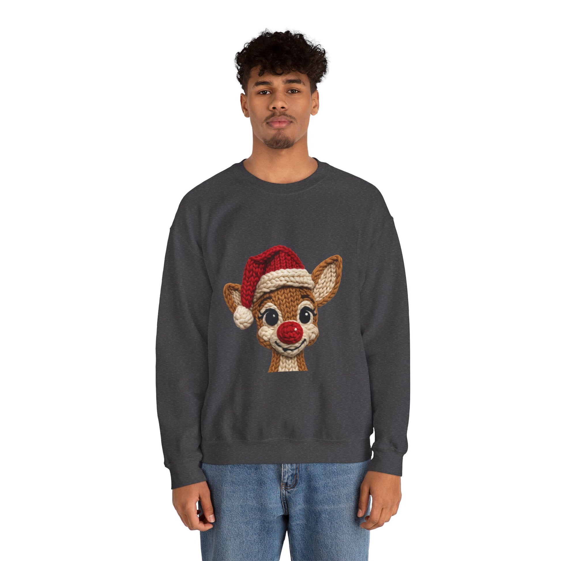 Christmas Crochet Reindeer Crewneck Sweatshirt – Cute Rudolph Face with Santa Hat