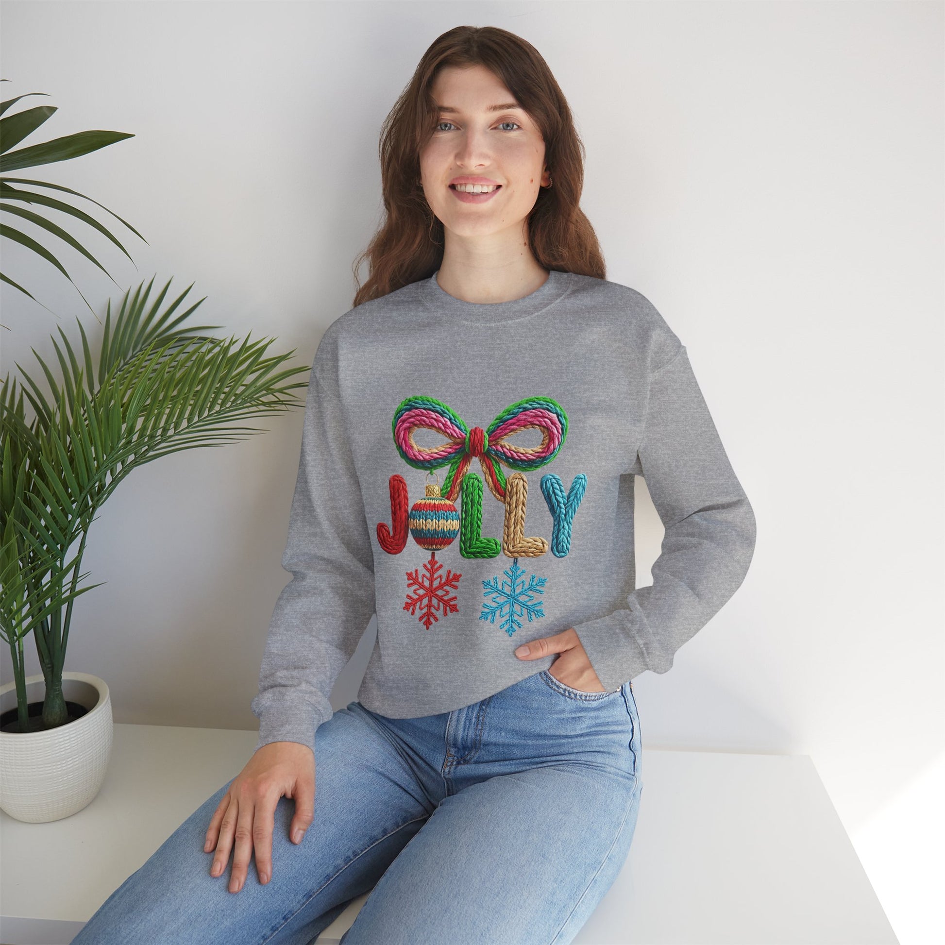 A cozy, cheerful crewneck sweatshirt embroidered with colorful, yarn-like lettering that reads “JOLLY,” finished with a playful bow, ornament detail, and two snowflakes. The medium-heavy 50/50 cotton-poly blend feels soft against skin and holds shape, while tubular knit construction and double-needle stitching ensure long-lasting wear. It sits with a classic, relaxed silhouette — easy to layer over shirts or under coats — and carries a handmade, nostalgic holiday vibe that brightens chilly days and casual gatherings.